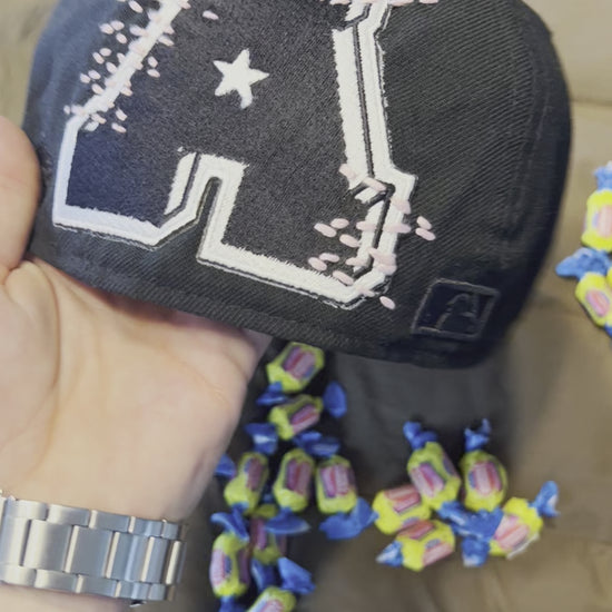 Custom New Era fitted cap with hand-stitched patchwork. SZ 7 1/4.